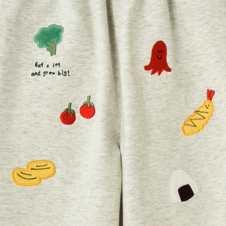 たこさんウィンナーやエビフライなどお弁当のおかずがアップリケになったかわいいデザインになっています。