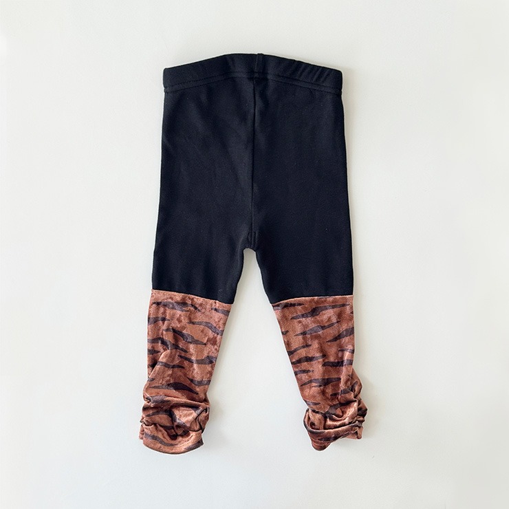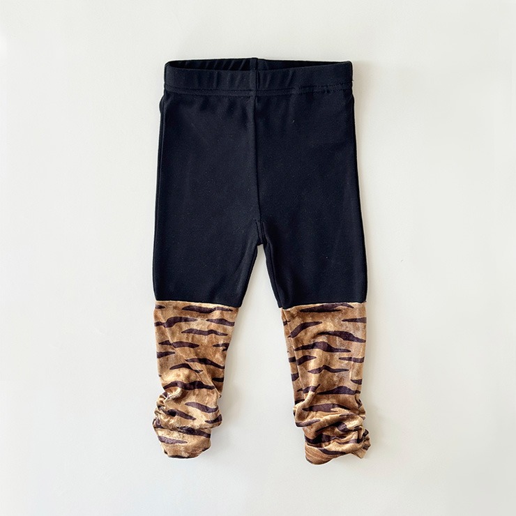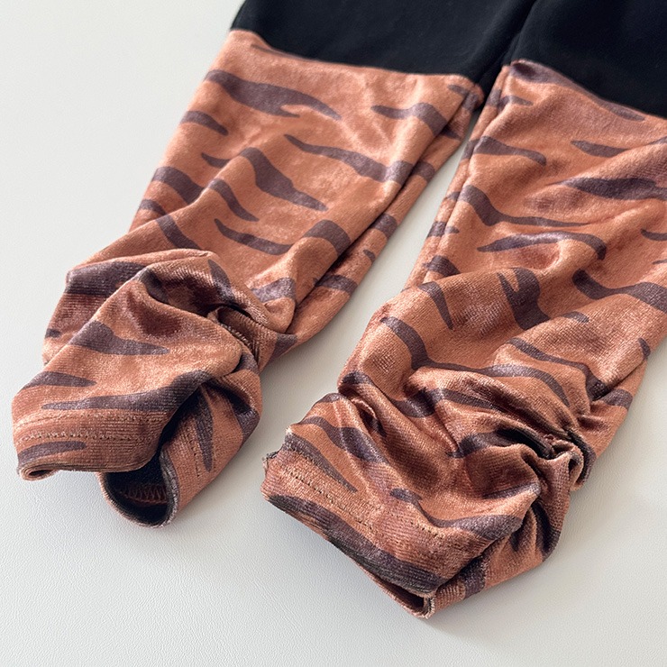 綿100%のスムース素材にベロア素材のトラさん柄のレッグウォーマーがドッキングされたデザインです。