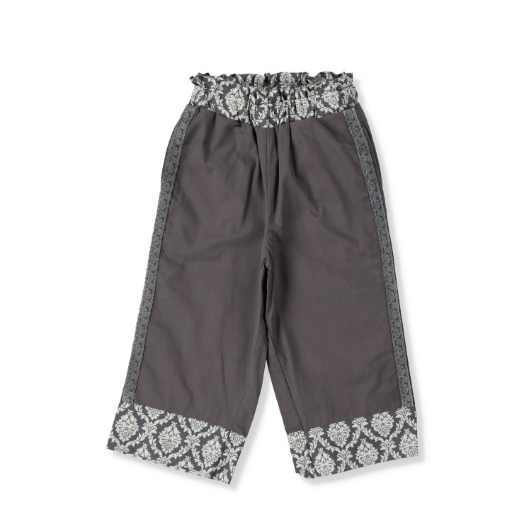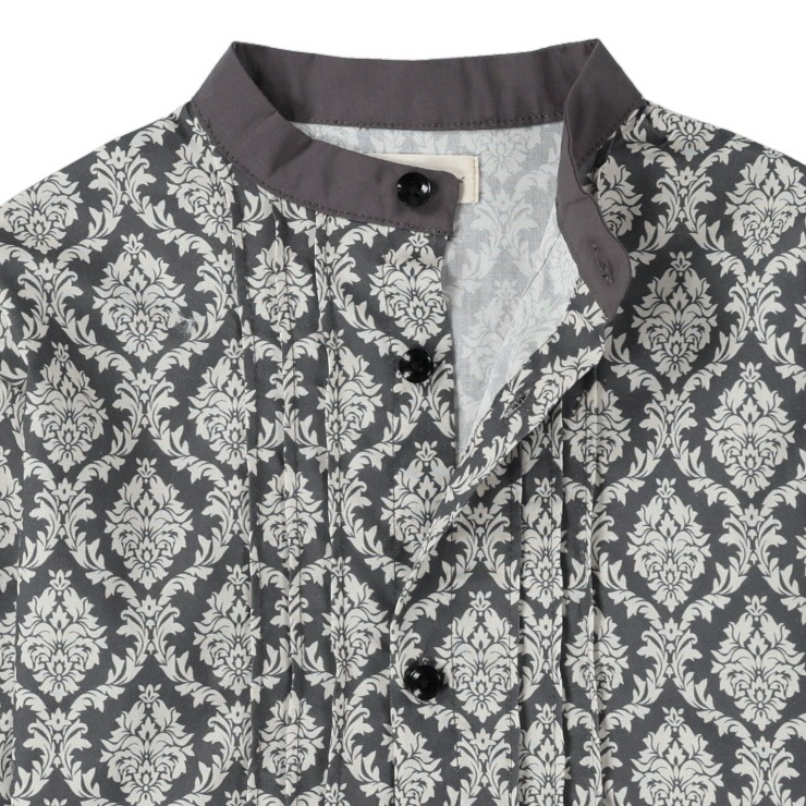 シックなカラーのアンティークな総柄プリントに配色使いやタック使いがアクセントになっています。