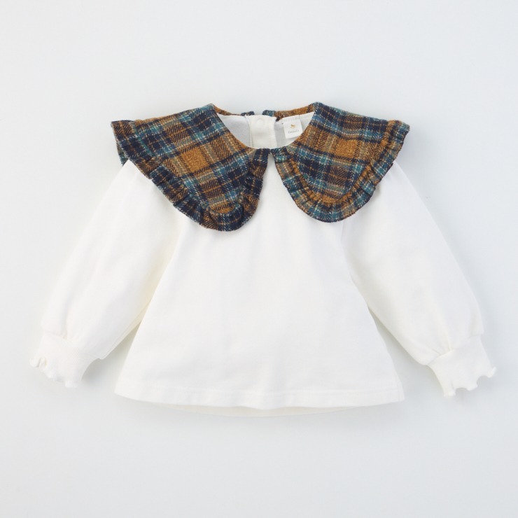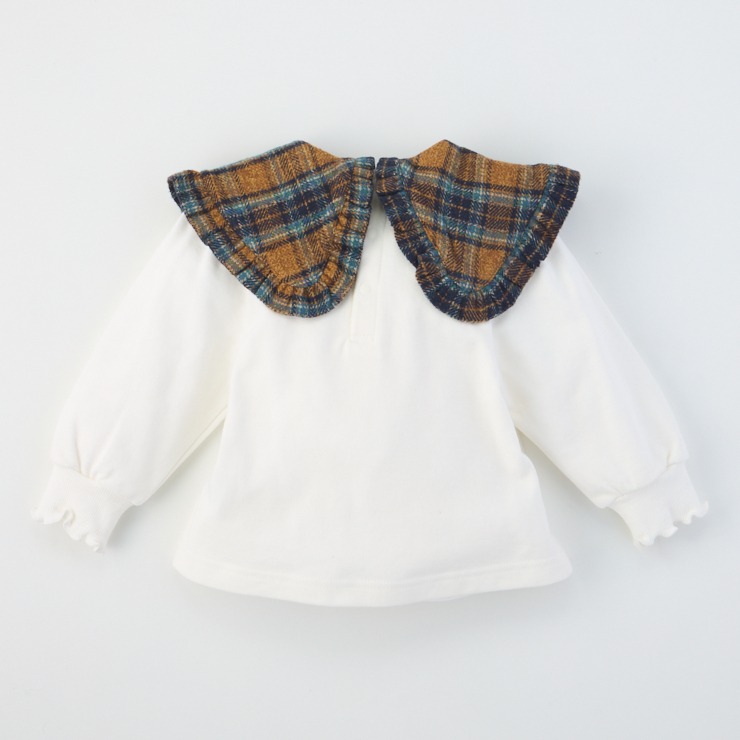 チェック柄にフリルがついた大きな襟デザインのかわいらしいデザインになっています。