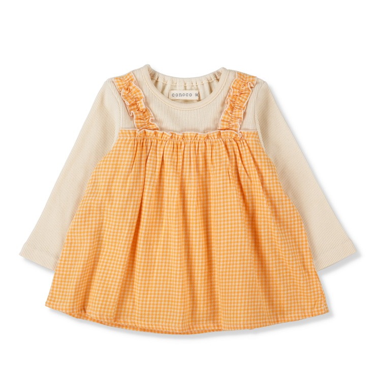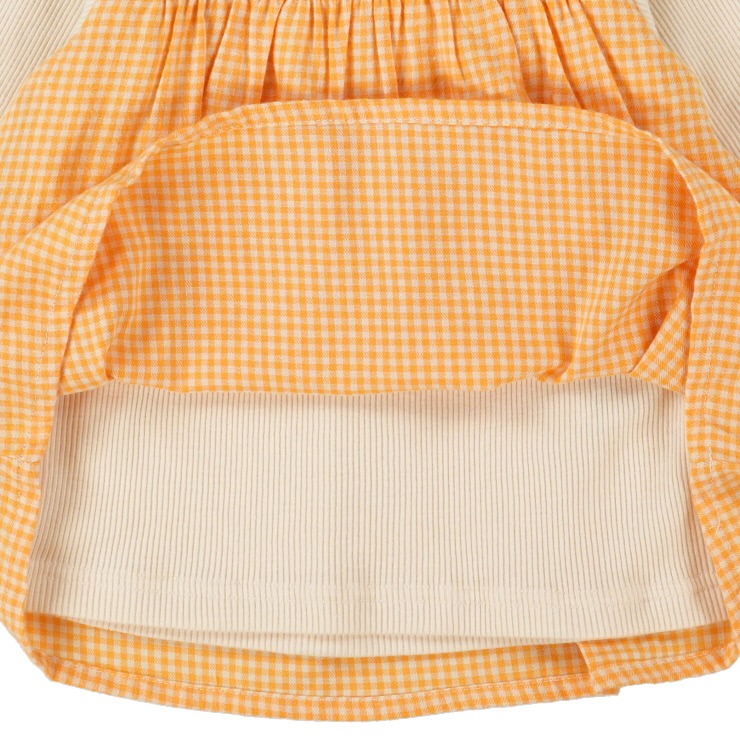 トップスインナー部分は肌触りの良いテレコ素材で、伸縮性抜群。活発に動くお子様の動きを妨げず、快適な着心地をキープします。スカート部分は、春らしい先染めギンガムチェックを使用し、軽やかなムードを演出。