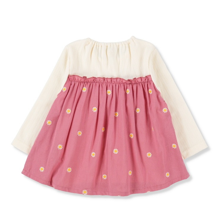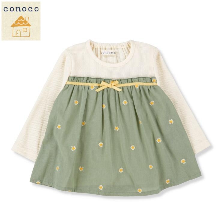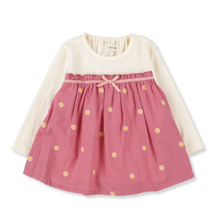長袖部分は、伸縮性抜群のテレコ素材を使用し、活発に動くお子様の動作を妨げず、快適な着心地をキープします。胸もと切り替えから広がる布帛部分は、サラリとした平織り生地に愛らしいデイジー刺しゅうを贅沢にあしらい、上品な華やかさを演出。