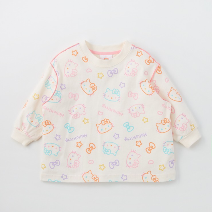 「キティ」がいっぱいのポップなカラーの総柄プリントにメロウ刺しゅうがアクセントになっています。