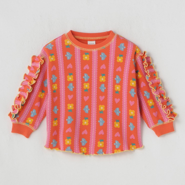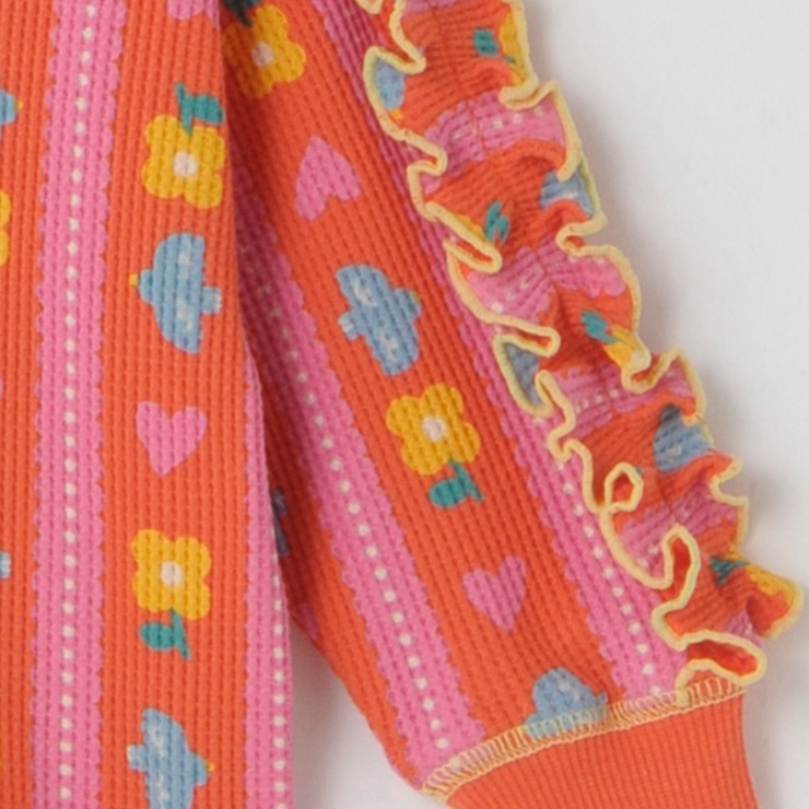 カラフルでポップな総柄プリントにフリル使いがアクセントになっています。