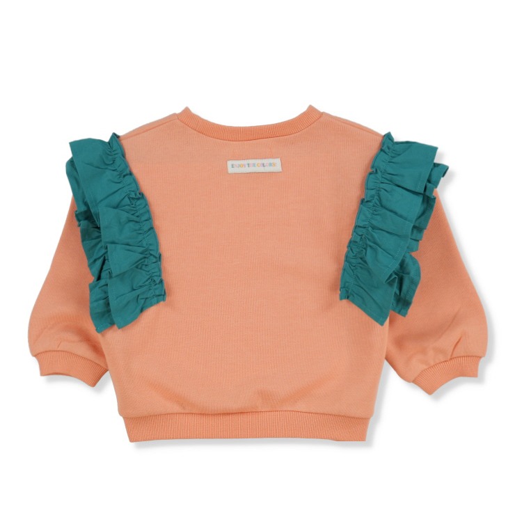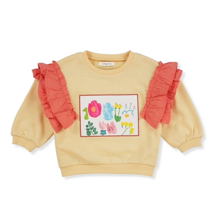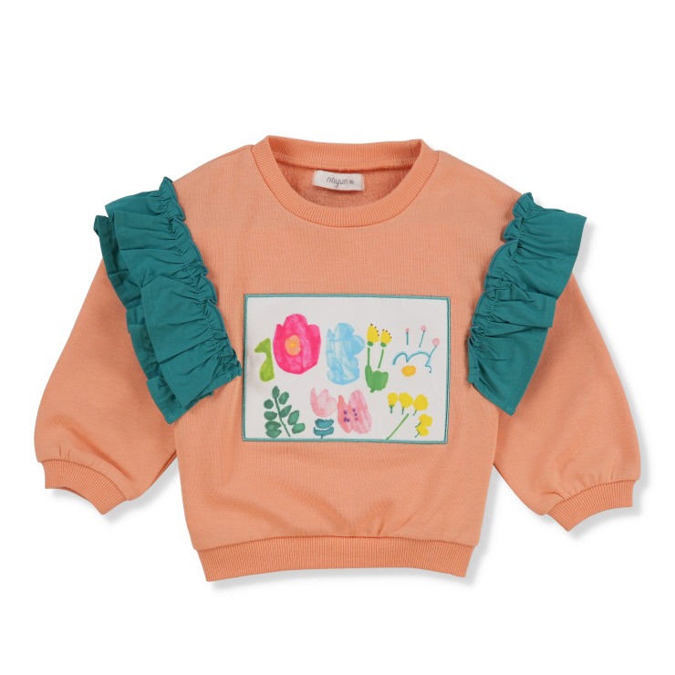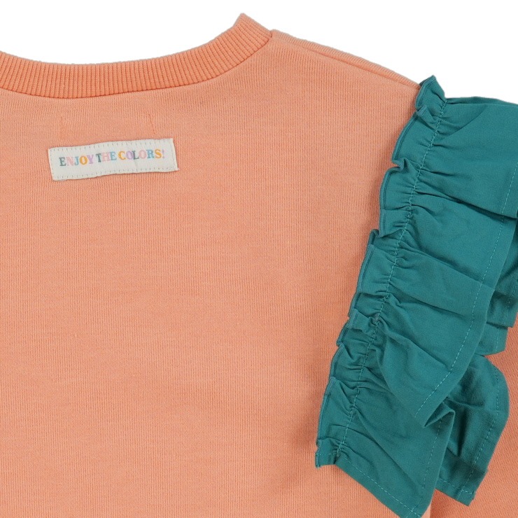 前身頃のプリントと肩の大きなフリルが目を引くトップスです。