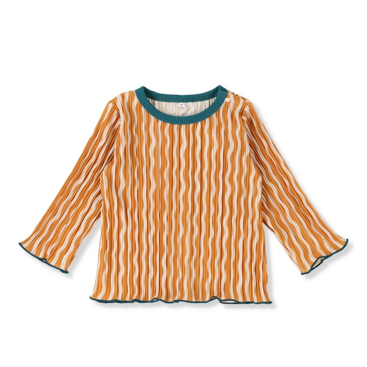 マスタードカラーが目を惹くプリーツ素材のトップス。