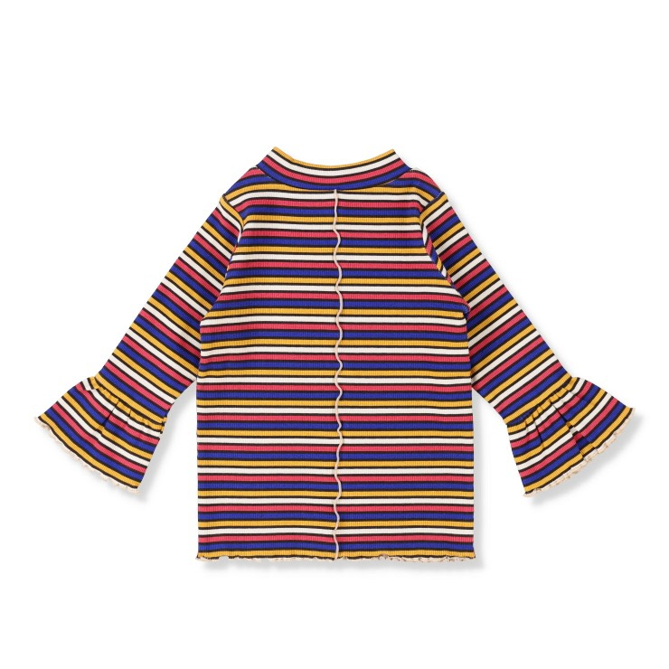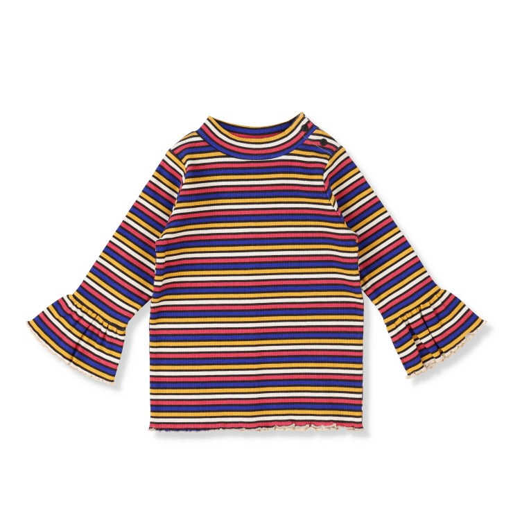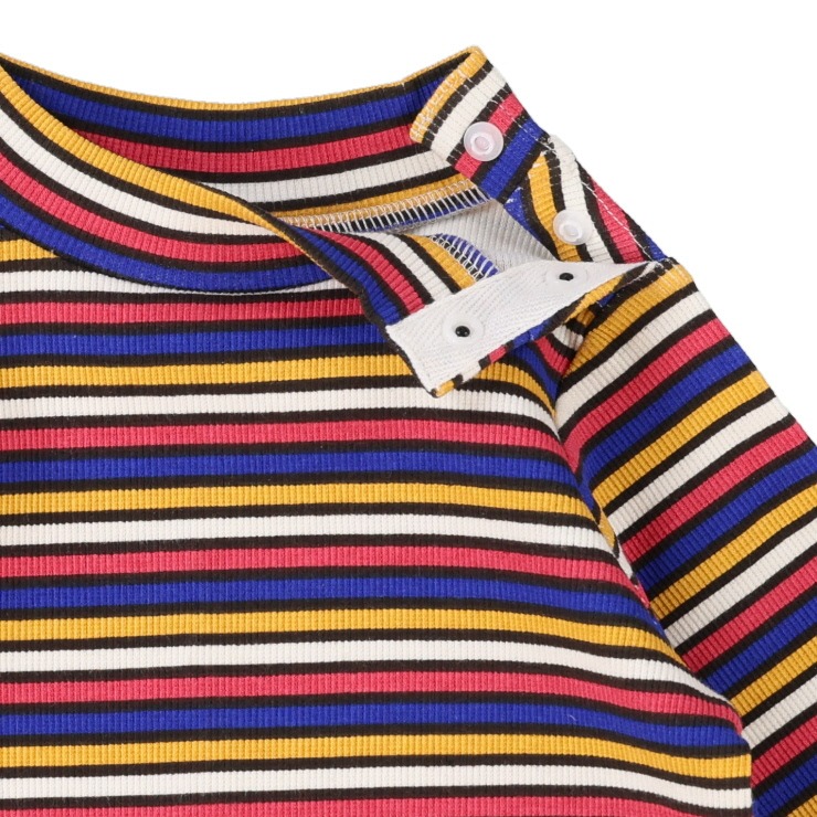 ポップなマルチカラーのボーダーが目を惹くテレコ素材のトップス。