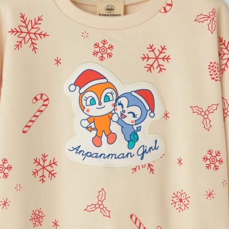 クリスマスをイメージしたモチーフの総柄にサンタ帽を被ったドキンちゃん、コキンちゃんのアップリケがデザインされております。