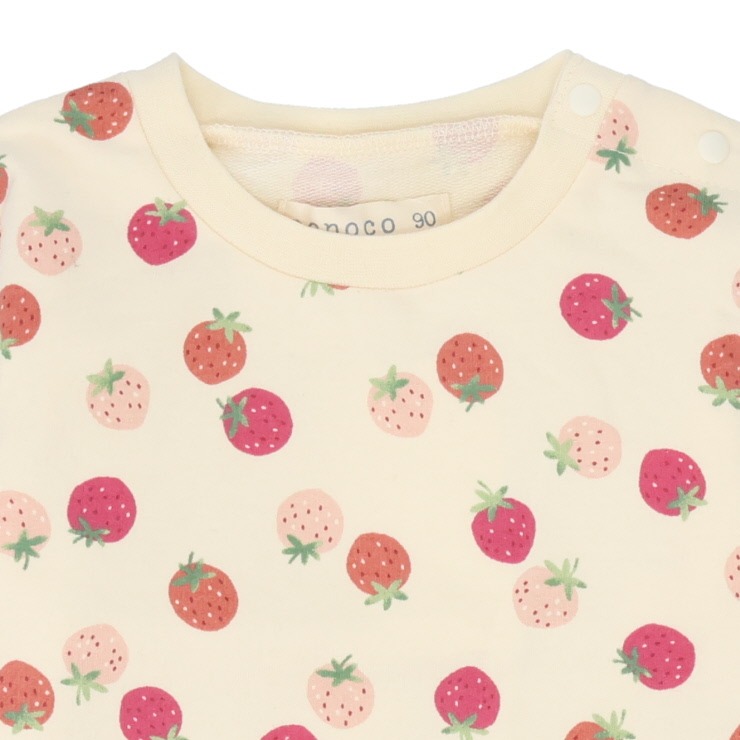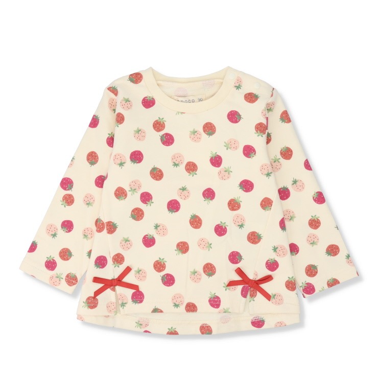 優しいアイボリーの生地に、大小さまざまなイチゴが散りばめられた長袖Tシャツ。