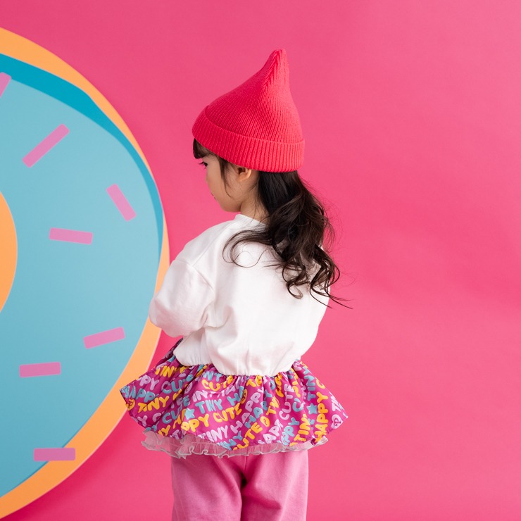 カラフルなロゴがいっぱいのフリルが切替になったキュートなペプラムシルエットになっています。