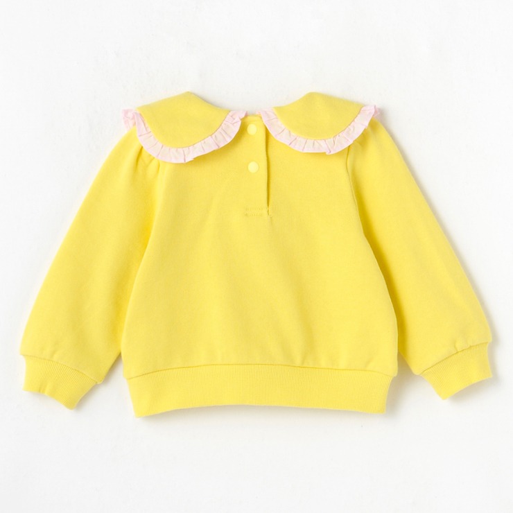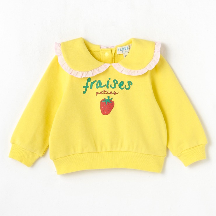 フリルが付いた襟とワンピントのいちごプリントがポイントのコットン100%裏毛を使用したトレーナーです。フリルは重ね着してもかわいいスタイリングになります。