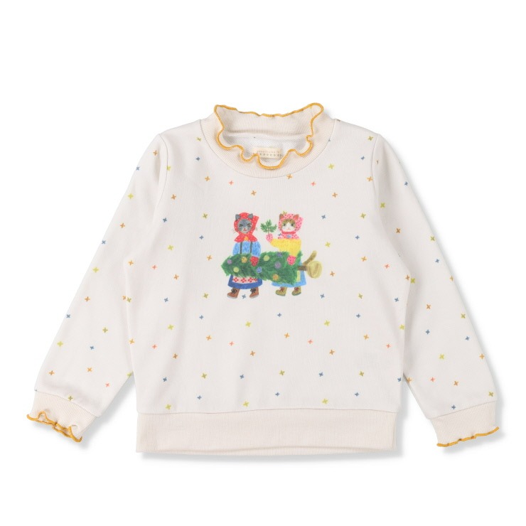 ツリーを運んでいる優しい表情の猫がプリントされたトップスです。