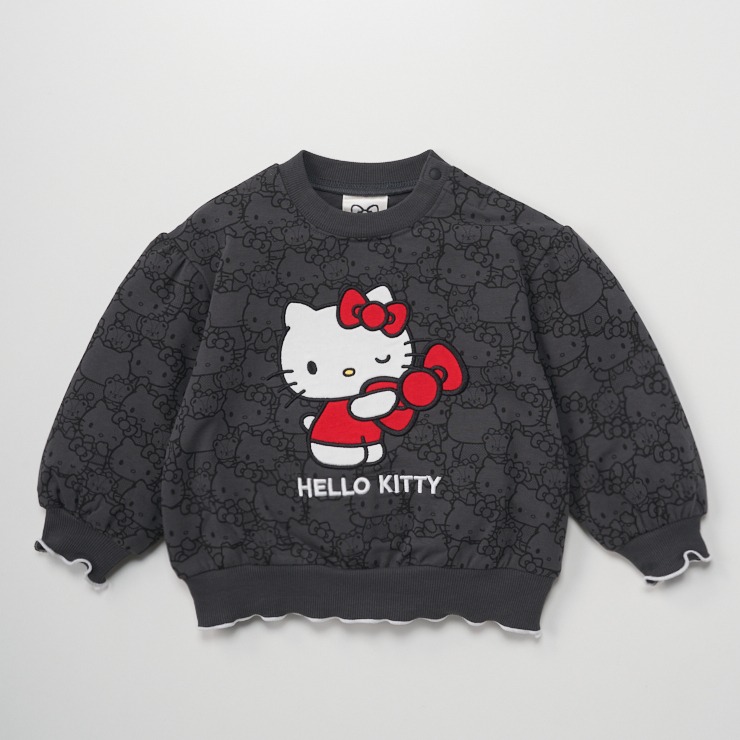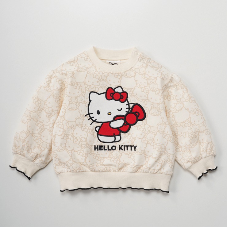 「ハローキティ」がいっぱいの総柄プリントに「ハローキティ」とリボンのアップリケがかわいいです。