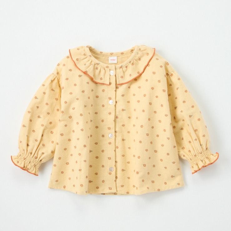 総柄にフリルの衿やシャーリングの袖がついたガーリーなデザインになっています。