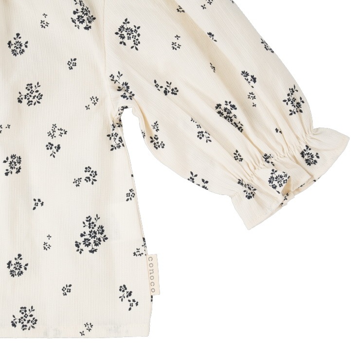 本体は、表面変化のあるドビーストライプの布帛素材を使用。単調にならず、生地の風合いが上品な華やかさを演出します。全体に散りばめられた紺色のお花柄が、落ち着いたトーンで可愛らしさを引き立てます。