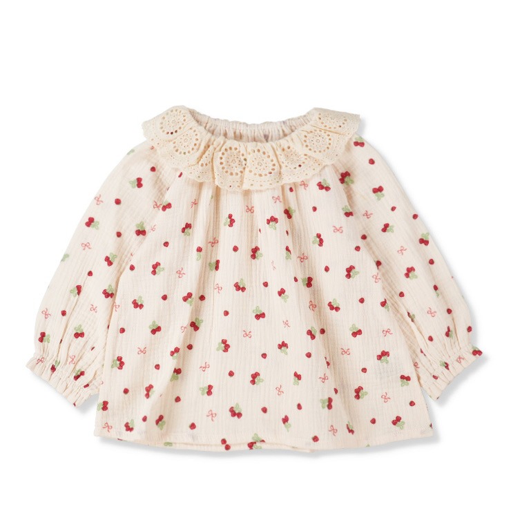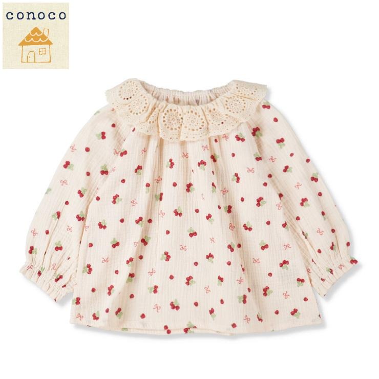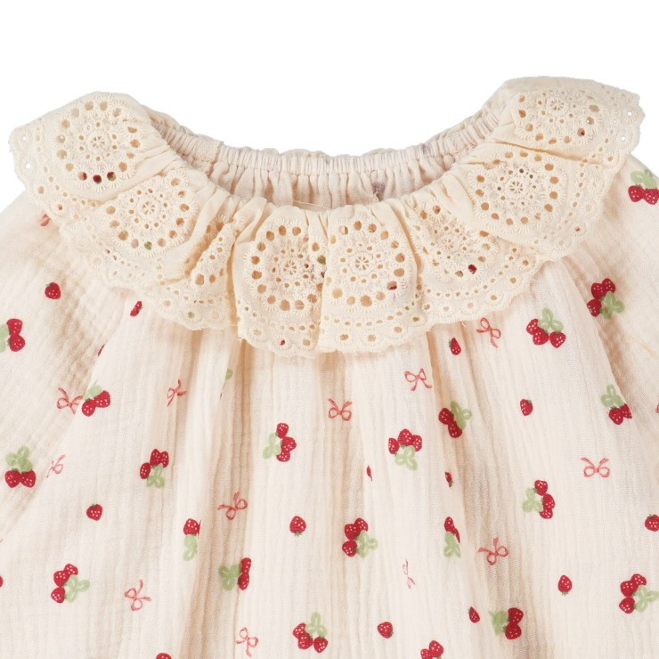本体は、肌触りが優しいしわガーゼ素材を使用。軽やかで、春の暖かい日も心地よく着用できます。全体に広がるいちごリボン柄が、愛らしい印象をぐっと高めます。