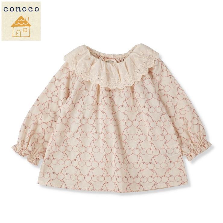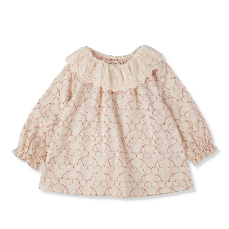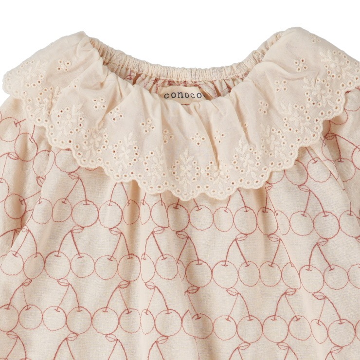 本体は、サラリとした肌触りの平織り生地を使用。軽やかで通気性も良く、春のお出かけに快適な着心地を提供します。生地全体にちりばめられたさくらんぼの刺しゅうが、さりげなくガーリーなムードを演出します。