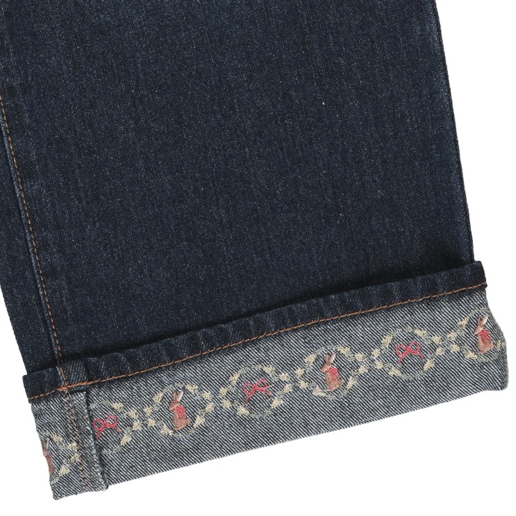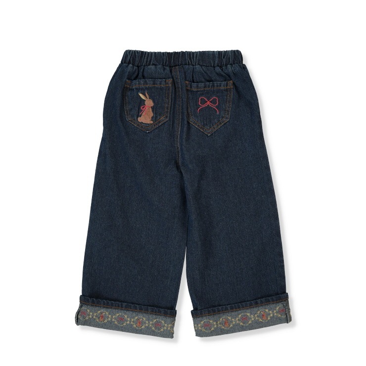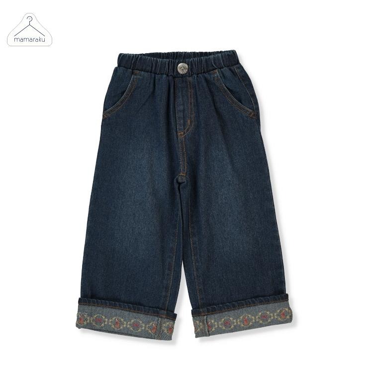 裾とポケットの刺しゅうがキュートなデニムパンツです。