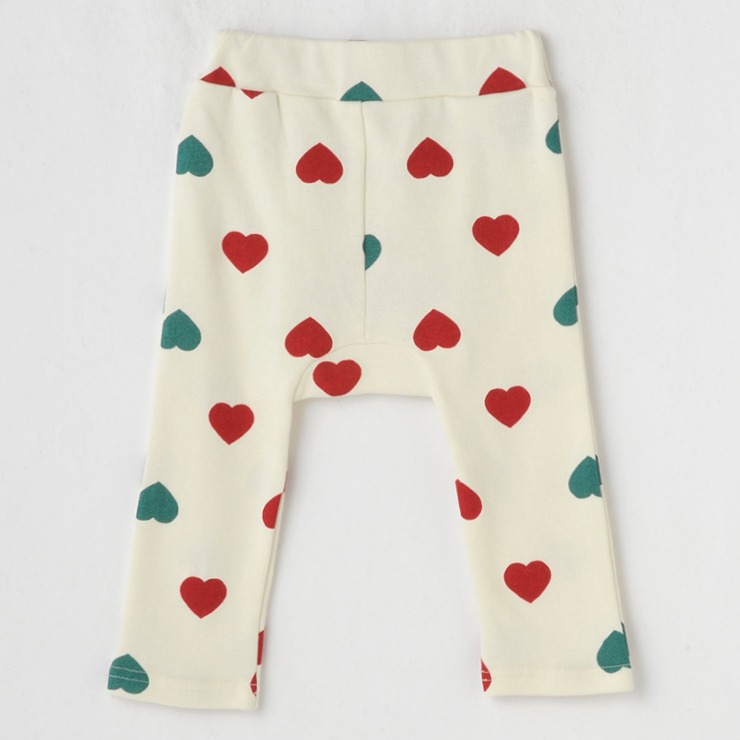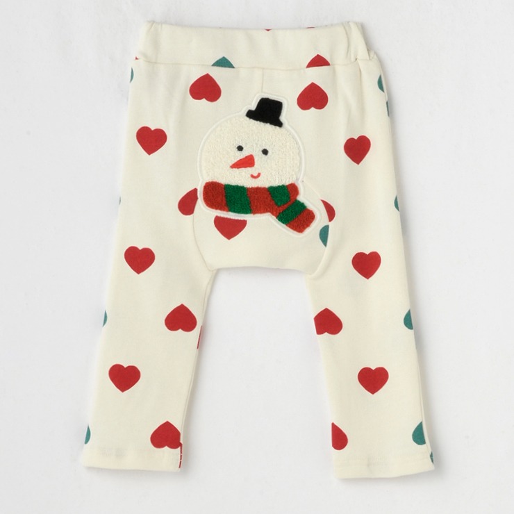 ハートがいっぱいの総柄に雪だるまのモチーフがついたかわいいデザインになっています。