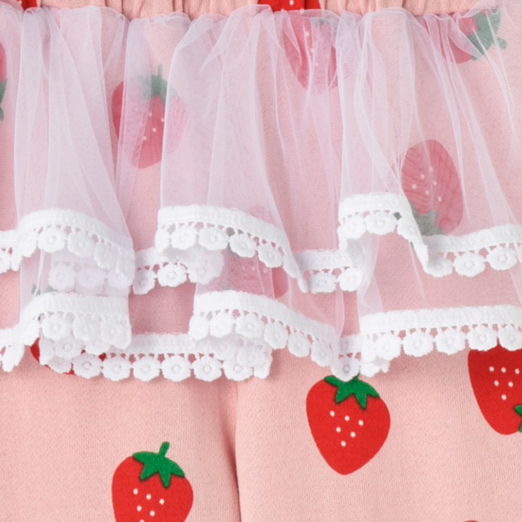 いちごの総柄プリントにチュール素材のフリル使いがかわいいです。