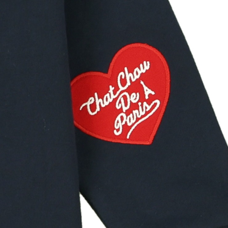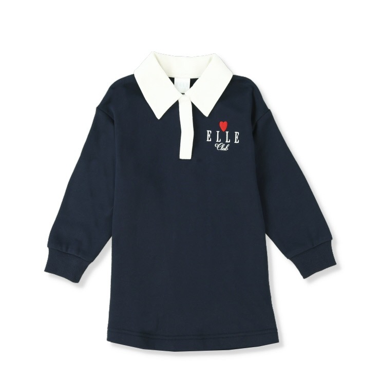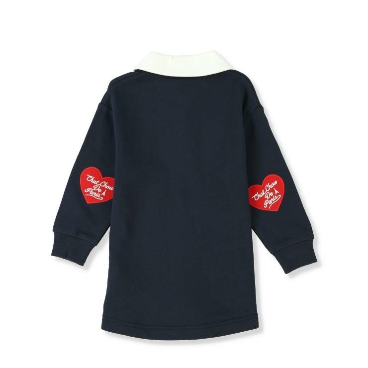 配色の襟付きデザインにハートのアップリケや刺しゅう使いがかわいいアクセントになっています。