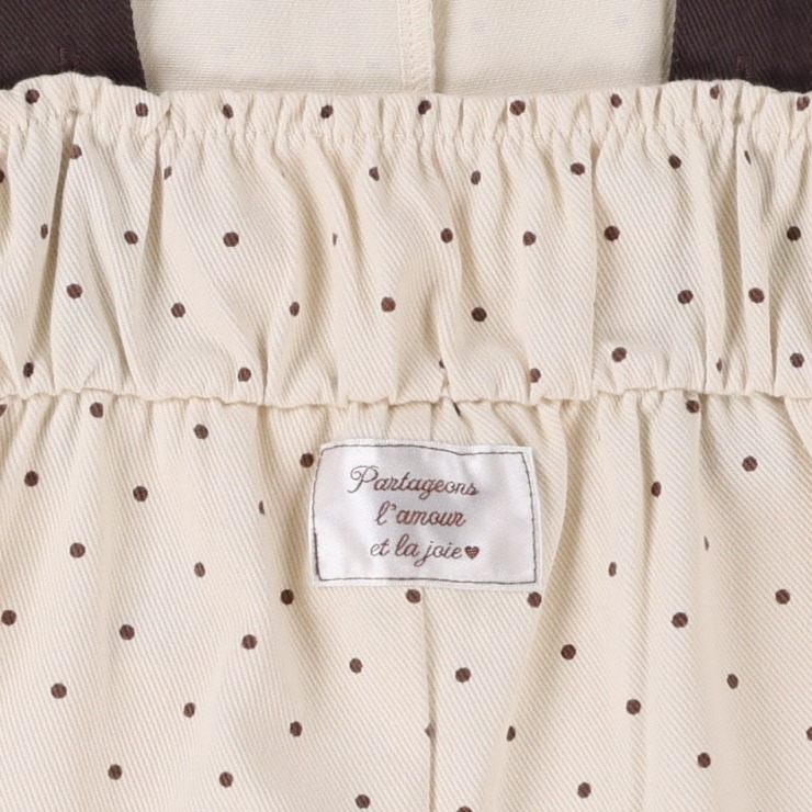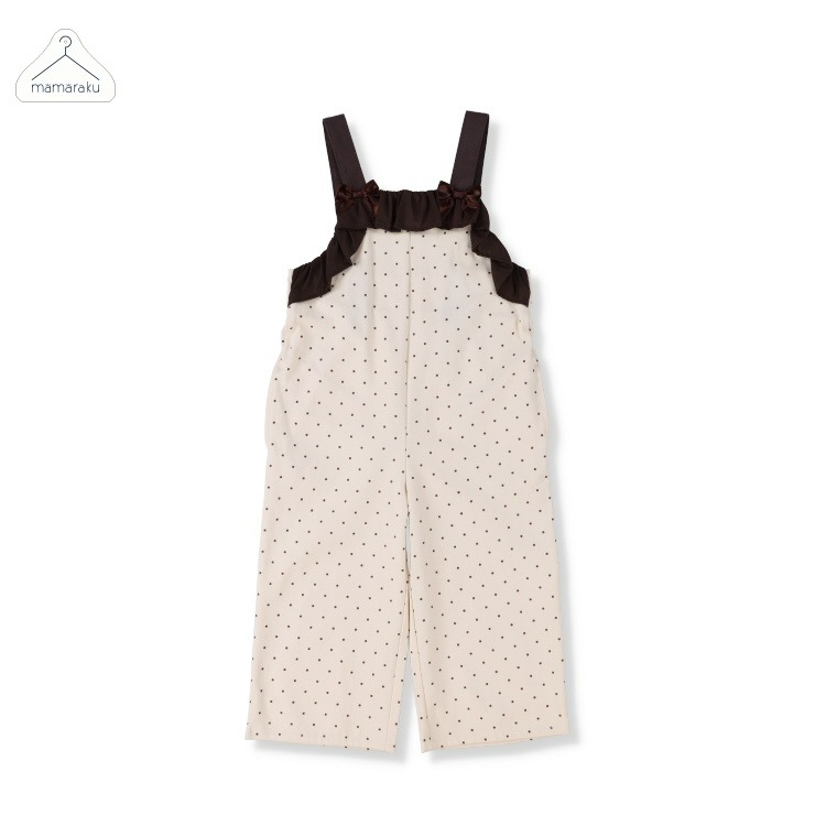ドット柄の生地と胸元の大きなフリルがキュートなサロペットです。