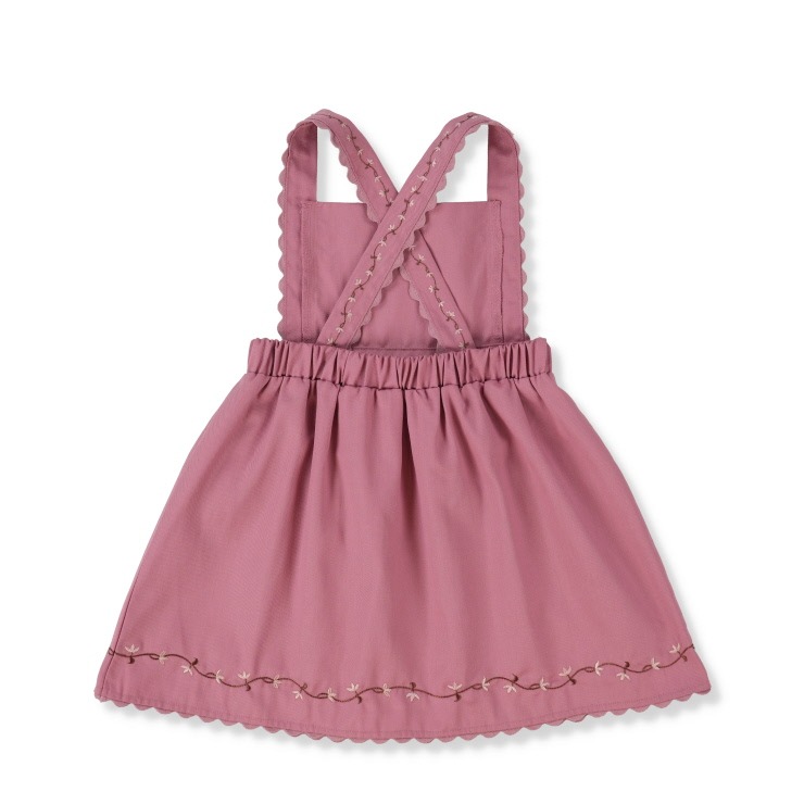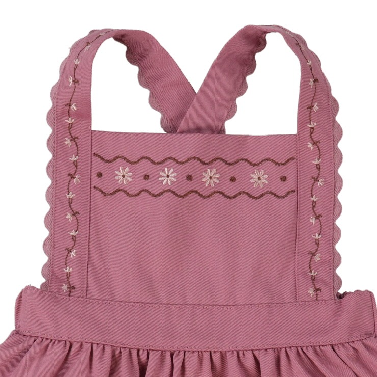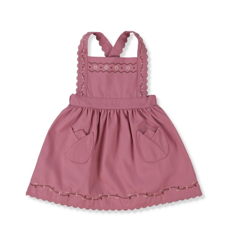深みのある色合いとお花の刺しゅうがかわいいエプロンワンピースです。
