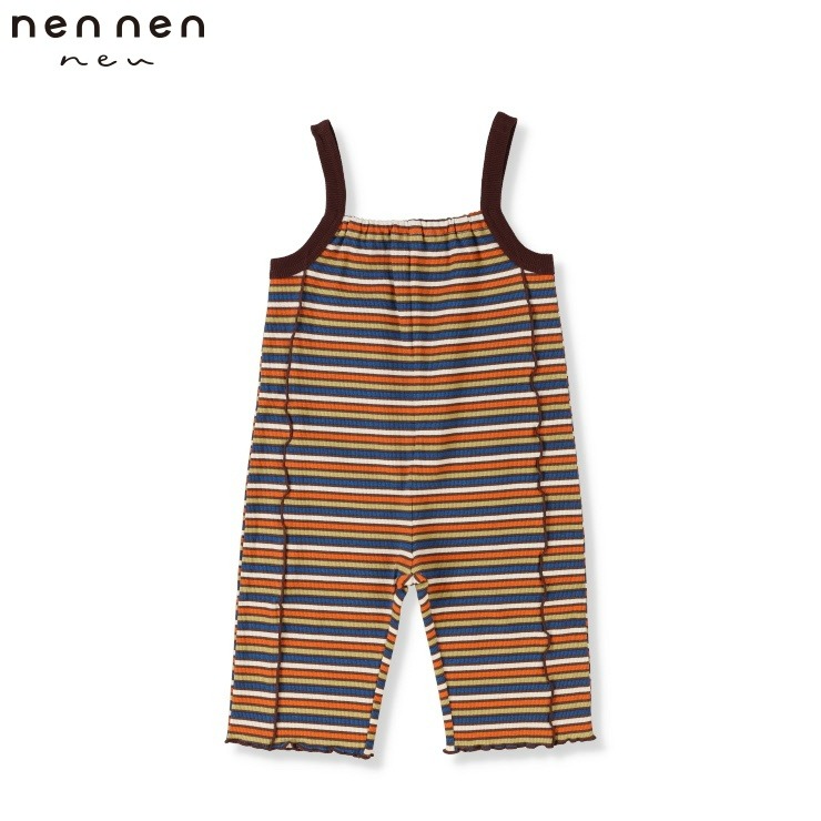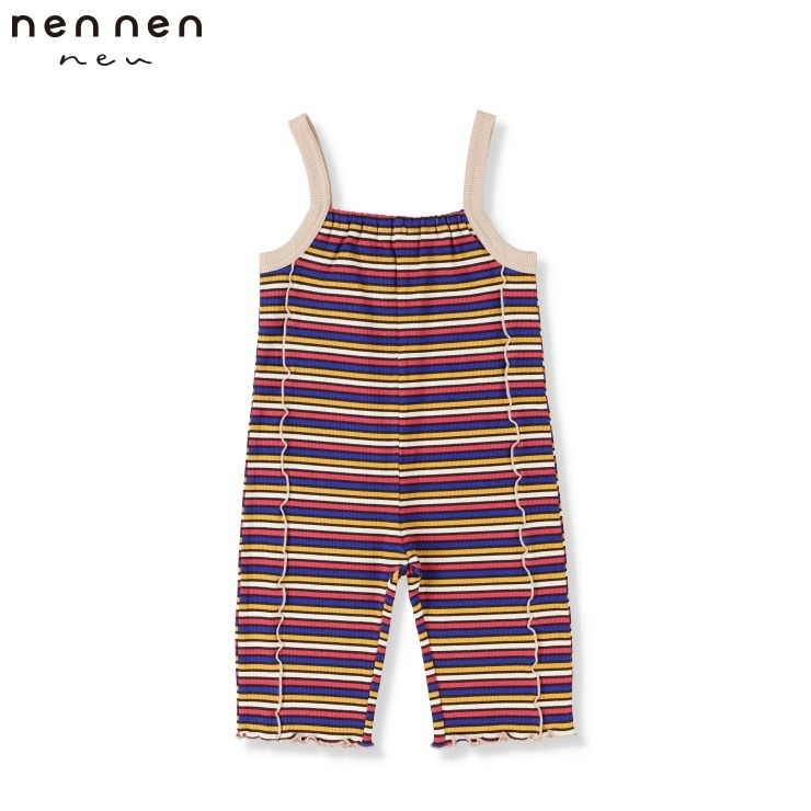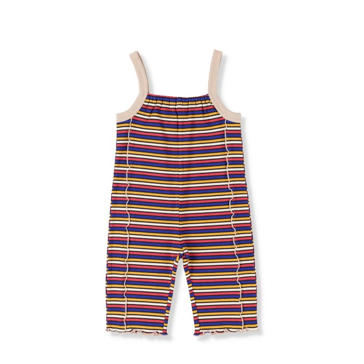 ポップなマルチカラーのボーダーが目を惹くテレコ素材のサロペット。