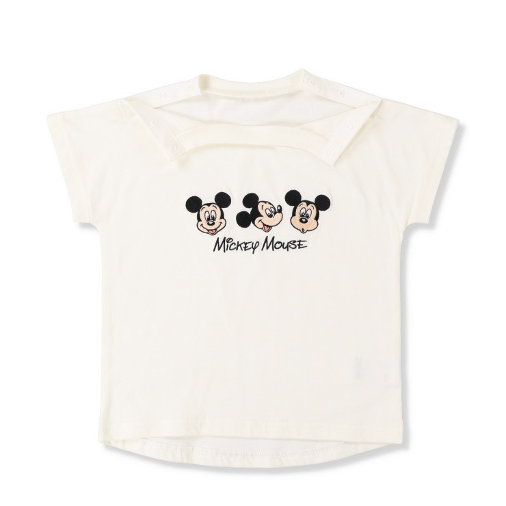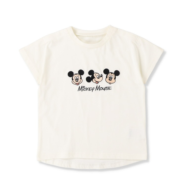 ミッキーのポップな表情が3つ並んだドルマンスリーブTシャツです。