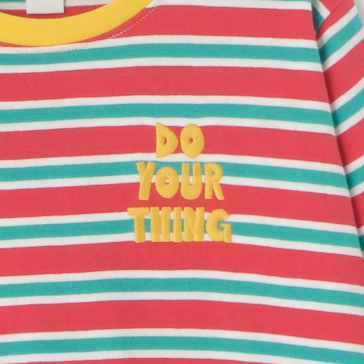 マルチカラーのボーダー柄にロゴ刺しゅうがアクセントになっています。