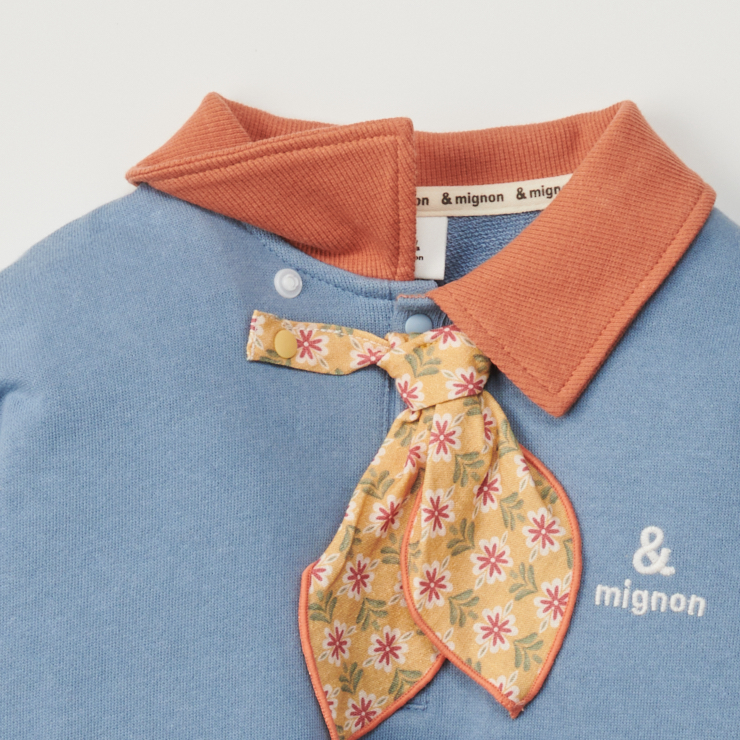 柄のスカーフをまいたようなタイがついたおしゃれなデザインです。