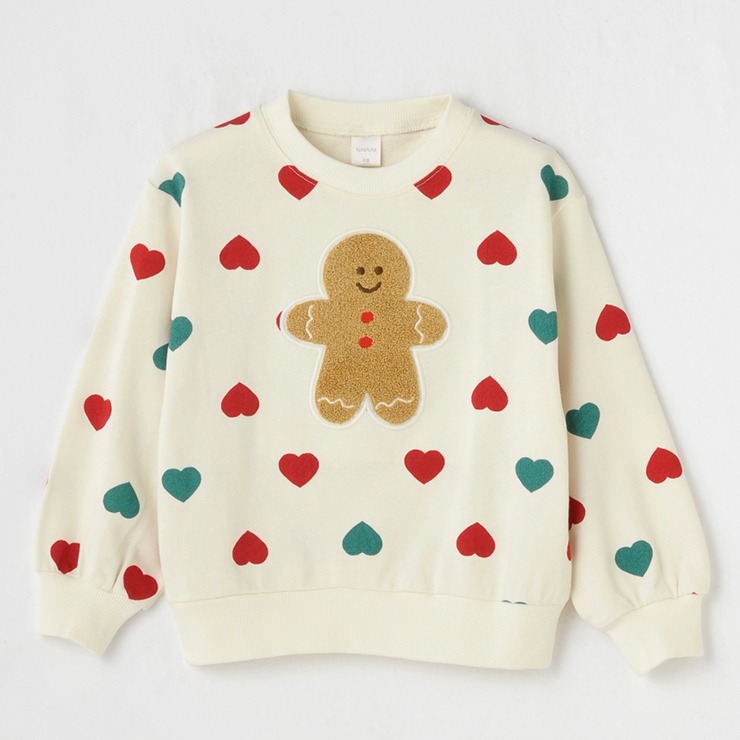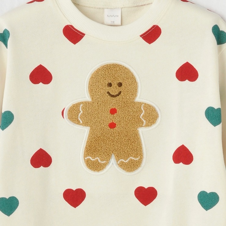 ハートがいっぱいの総柄にジンジャーマンをモチーフにしたぽこぽことしたサガラ刺しゅうがかわいいです。