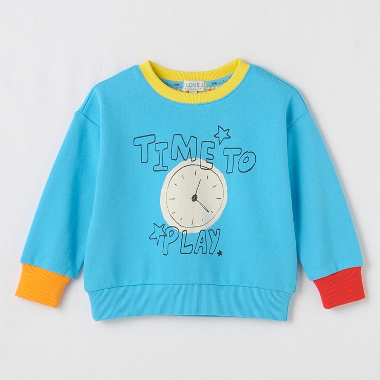 クレヨン風に仕上げた前身頃のプリントと、リブ配色が、子供らしい遊び心たっぷりの1枚です。コットン100%の裏毛素材を使用しており着心地も◎。