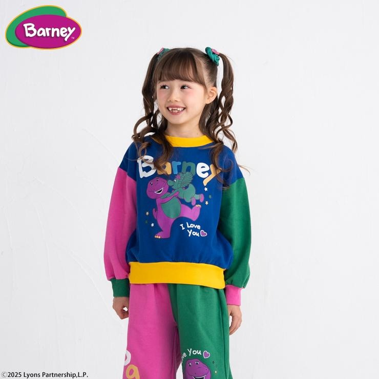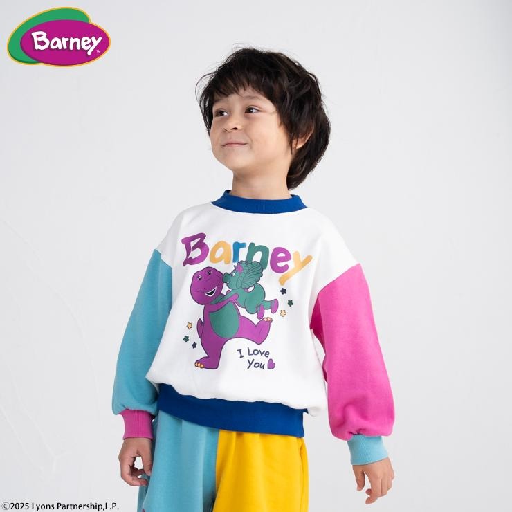 アシンメトリーの袖の配色デザインに「Barney」の英字ロゴとキャラクターのかわいいプリント使いになっています。