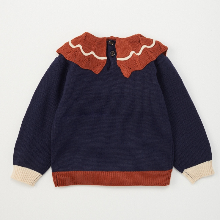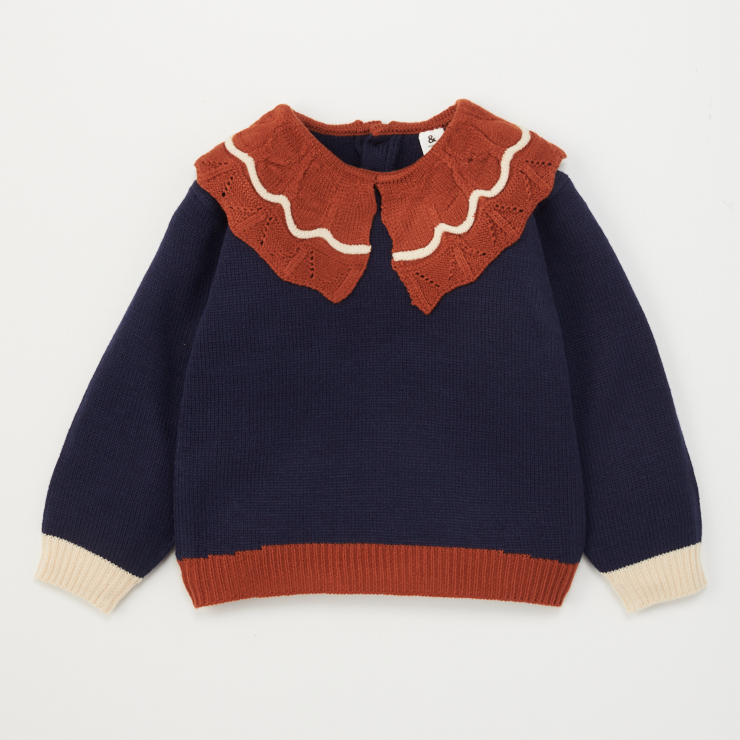 端がスカラップになった大きな襟使いに配色デザインがおしゃれです。