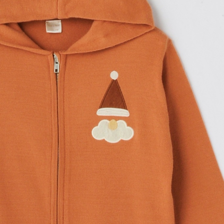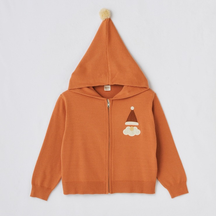 サンタクロースをイメージしたフード先のポンポン使いにフロントのニットアップリケデザインがかわいいです。