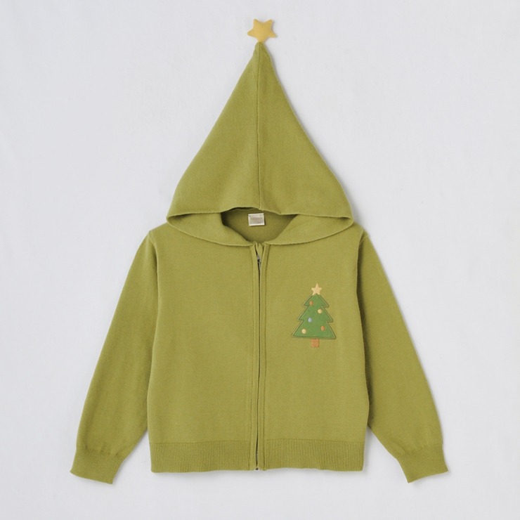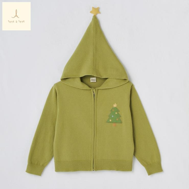 クリスマスツリーをイメージしたフード先のお星さま使いにフロントのニットアップリケデザインがかわいいです。