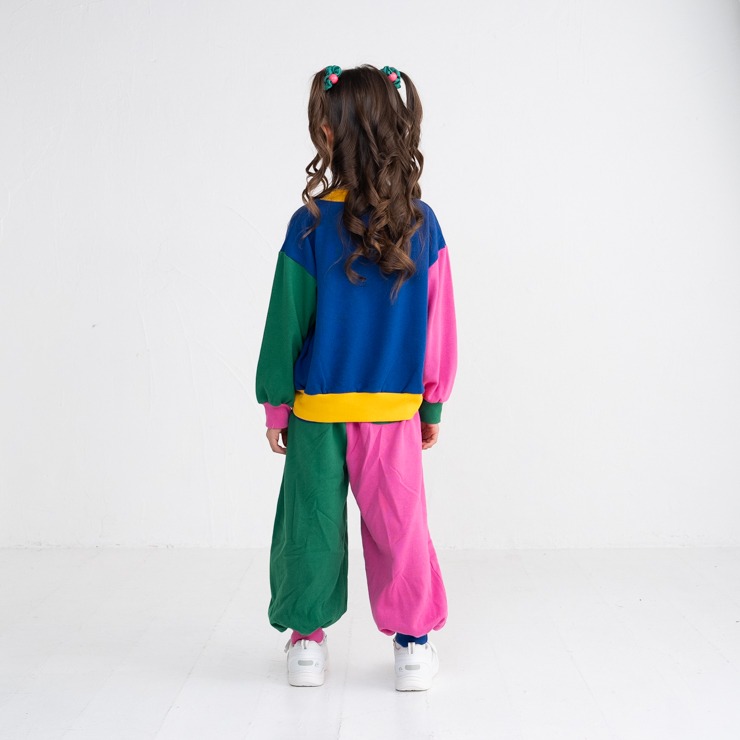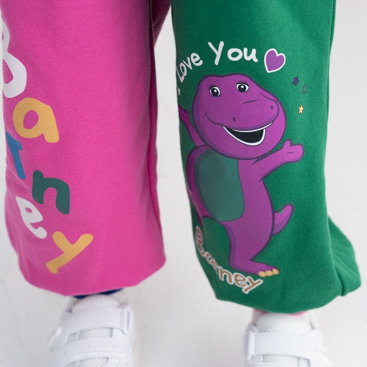 アシンメトリーの配色デザインに「Barney」の大きな英字ロゴとキャラクターのかわいいプリント使いになっています。