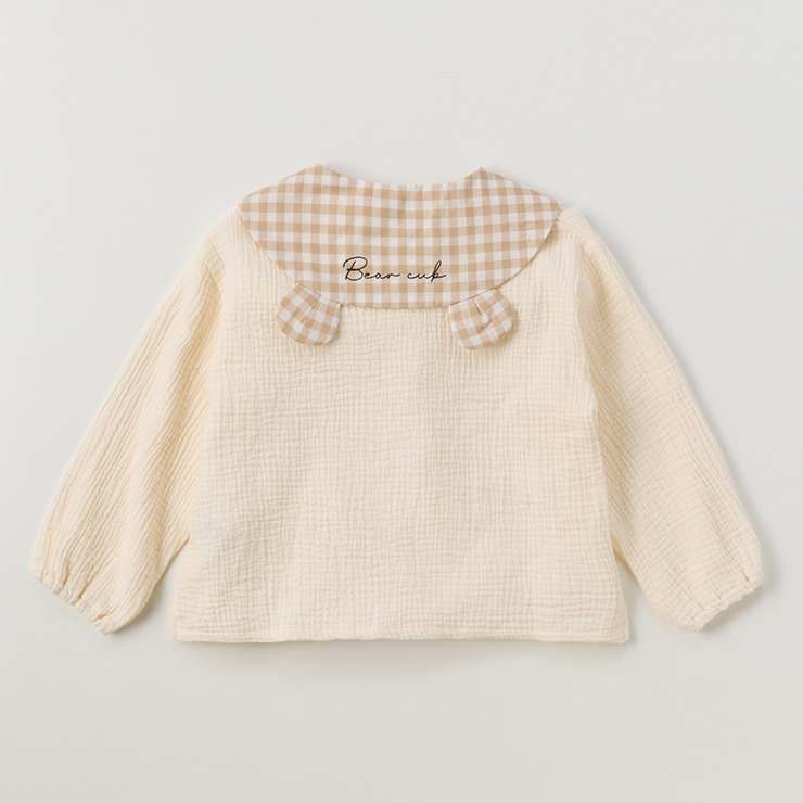 ギンガムチェックの襟にはくまさんの丸い耳がついています。