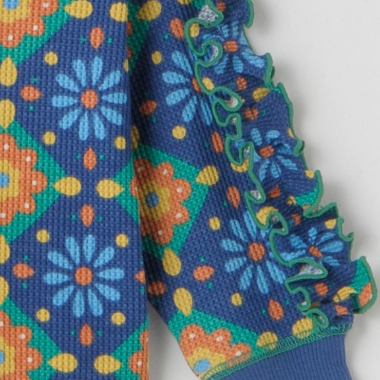 カラフルでポップな総柄プリントにフリル使いがアクセントになっています。