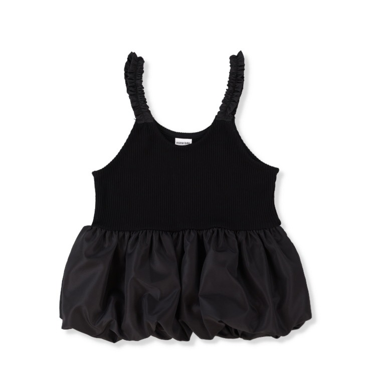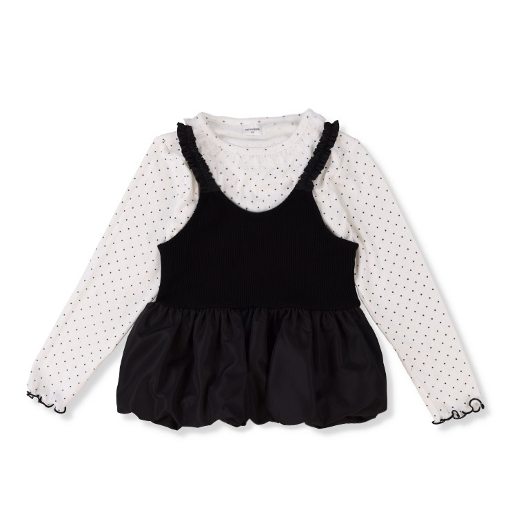 裾がバルーン状のビスチェとドット柄のプルオーバーが