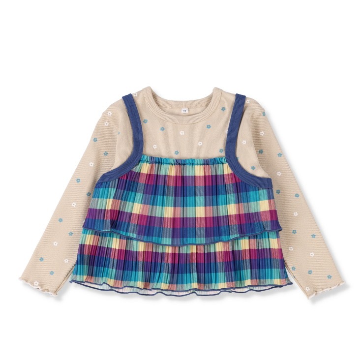 プリーツ素材のティアードキャミソールとテレコTシャツがドッキングされたデザイン。