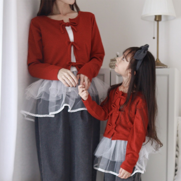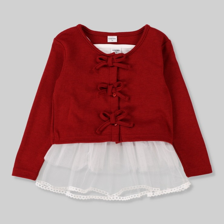 鮮やかな赤色のカーディガンとフリルがドッキングしたキャミインナーが