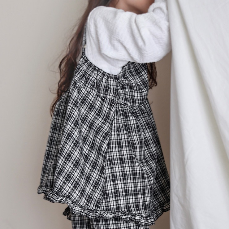 グレーのチェック柄のキャミソールと配色のメロウ加工を施したプルオーバーが