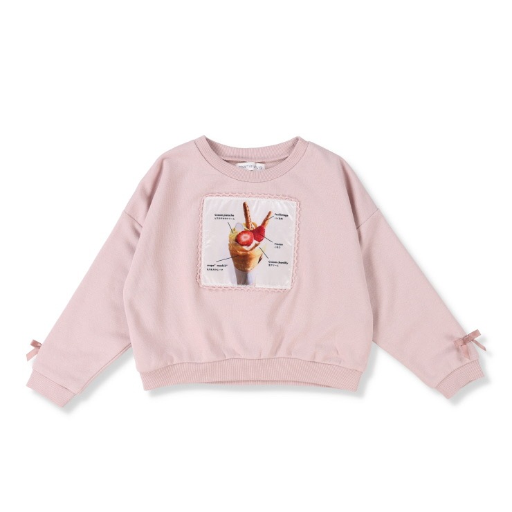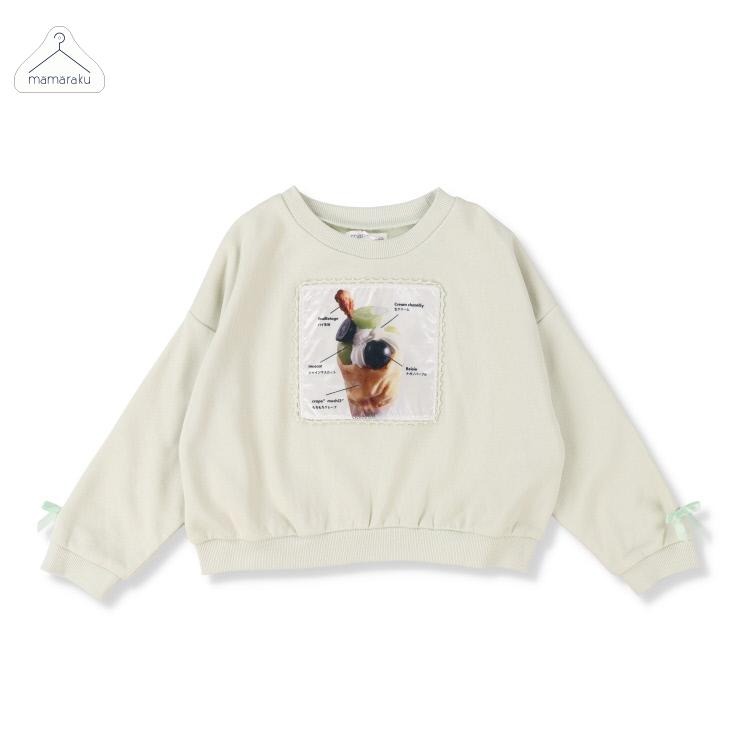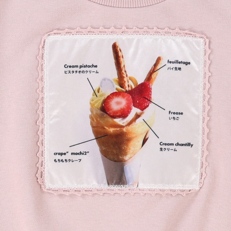 フルーツとクリームがたっぷりのおいしそうなクレープを大きくプリントしたトップスです。