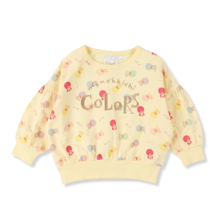 カラフルな総柄モンチッチの生地に、ロゴの刺しゅうがかわいい1枚です。