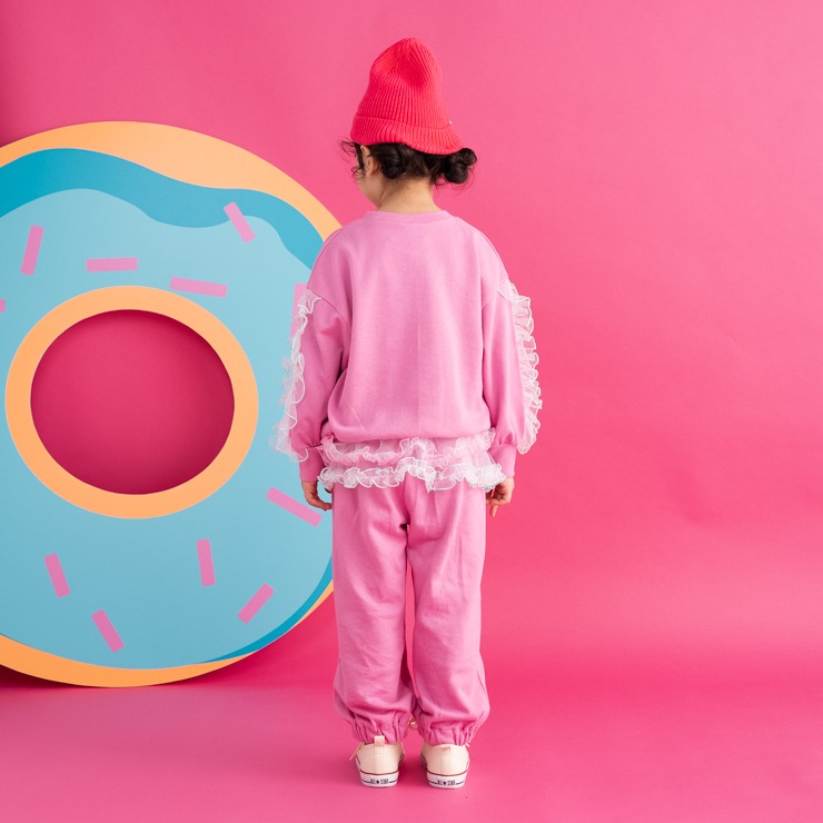 チュール素材のフリルがついた綿100%の裏毛素材を使用したロングパンツです。