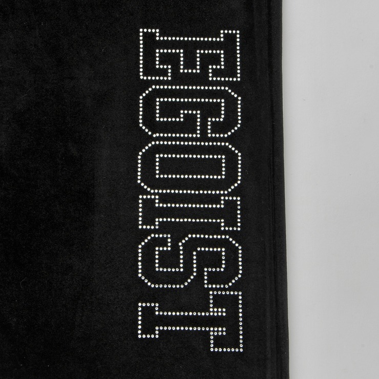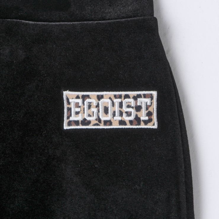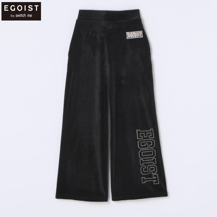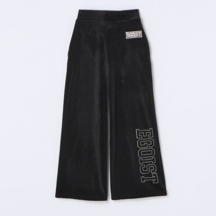 フロントのブランドロゴが目を引くベロアワイドパンツ。
