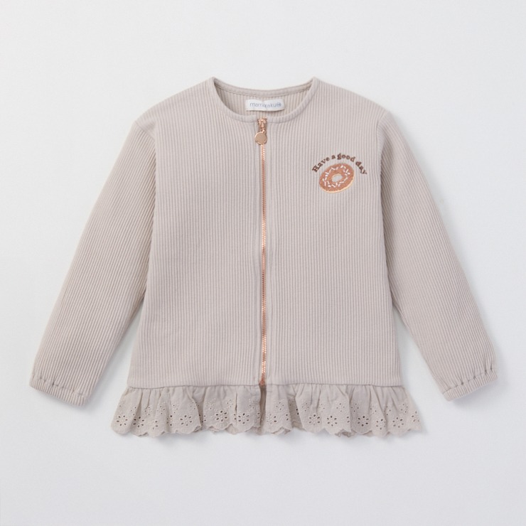 ドーナツの刺しゅうが入ったジャケットです。裾のフリルがアクセントになっています♪
