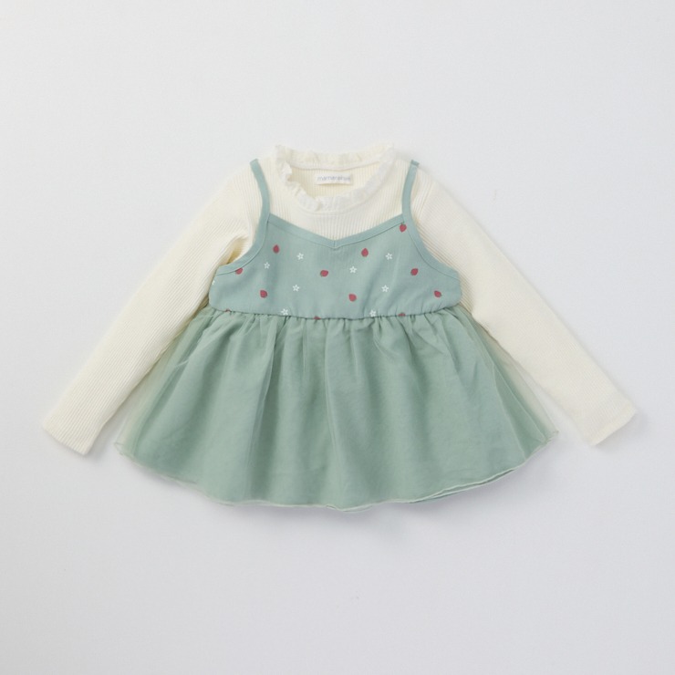 いちごのプリントがキュートなチュニックです。ふわっと重なったチュールがガーリーなデザインです♪